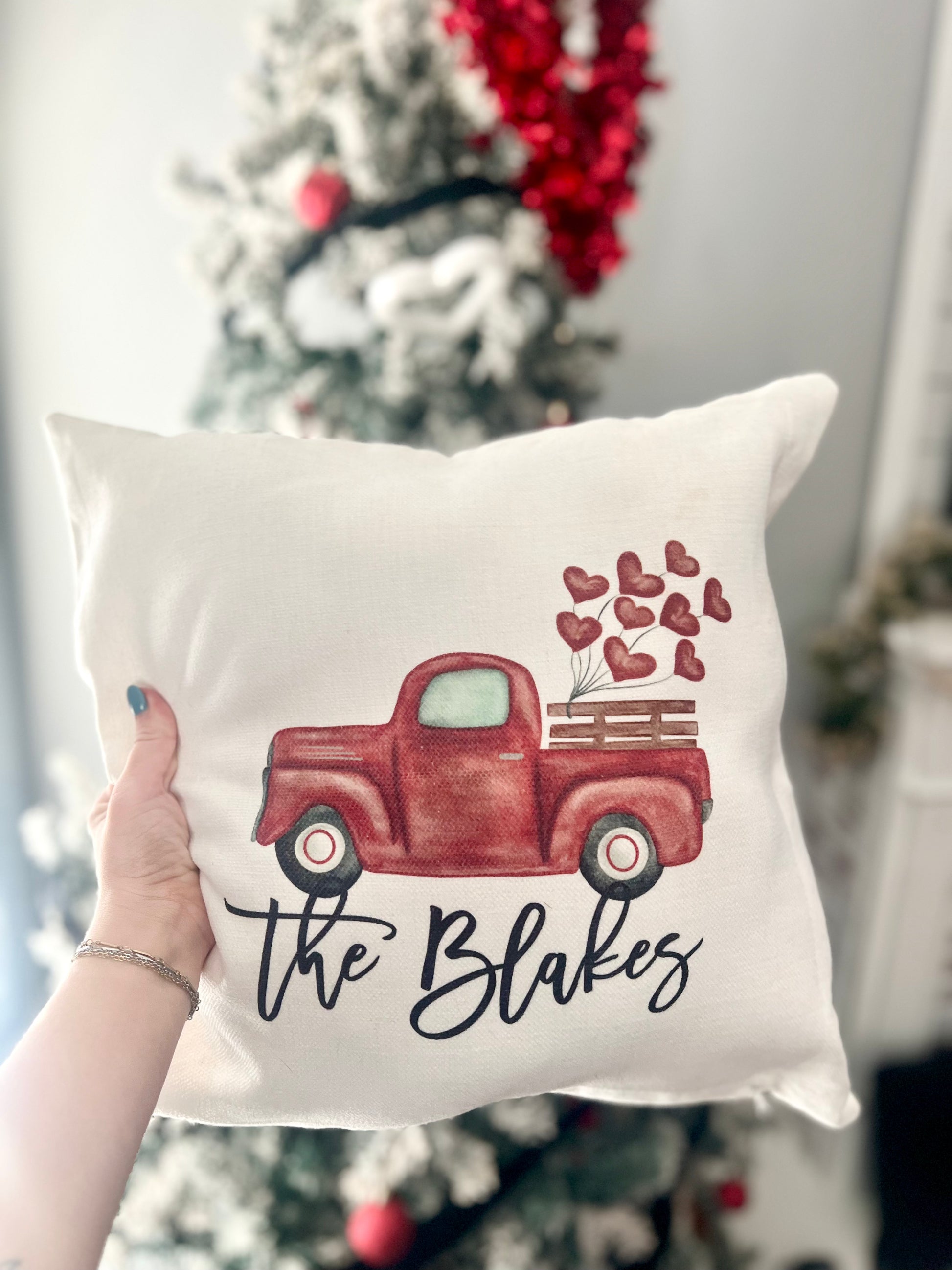 Celebrate love and family with this charming Custom Valentine's Truck Pillow, a heartwarming addition to your home décor. Personalized with your family name, this unique piece brings warmth and personality to any room—perfect for Valentine's Day. The truck design combined with romantic touches creates a cozy, inviting atmosphere that guests will adore. Whether you're decorating your living room, bedroom, or gifting it to someone special, this customizable pillow lets you add a personal touch that makes it truly one-of-a-kind. Transform your space into a reflection of what matters most—family and love.