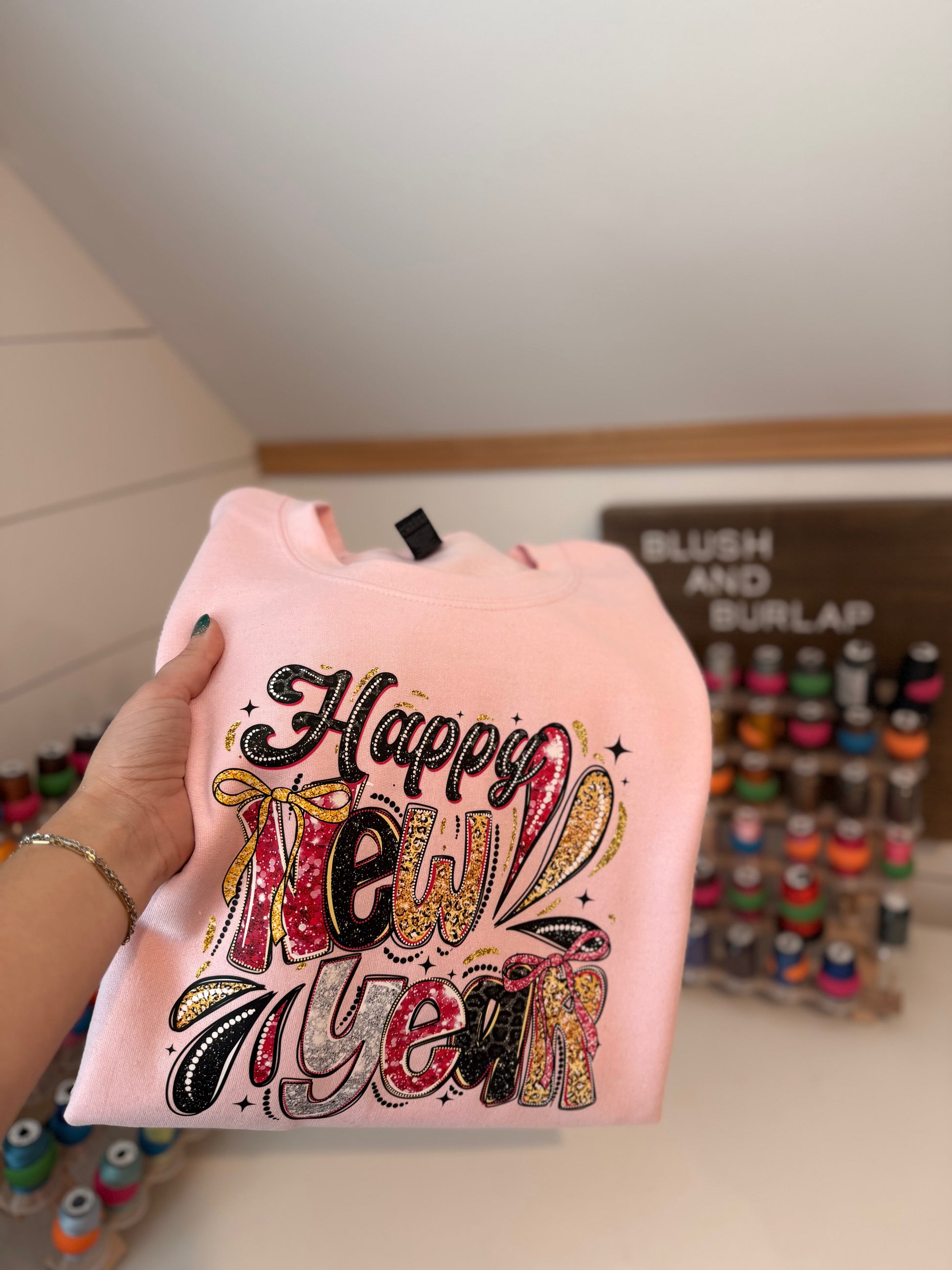 Gildan sweatshirt. 50/50 blend. Unisex sizing. DTF printed (on light pink).