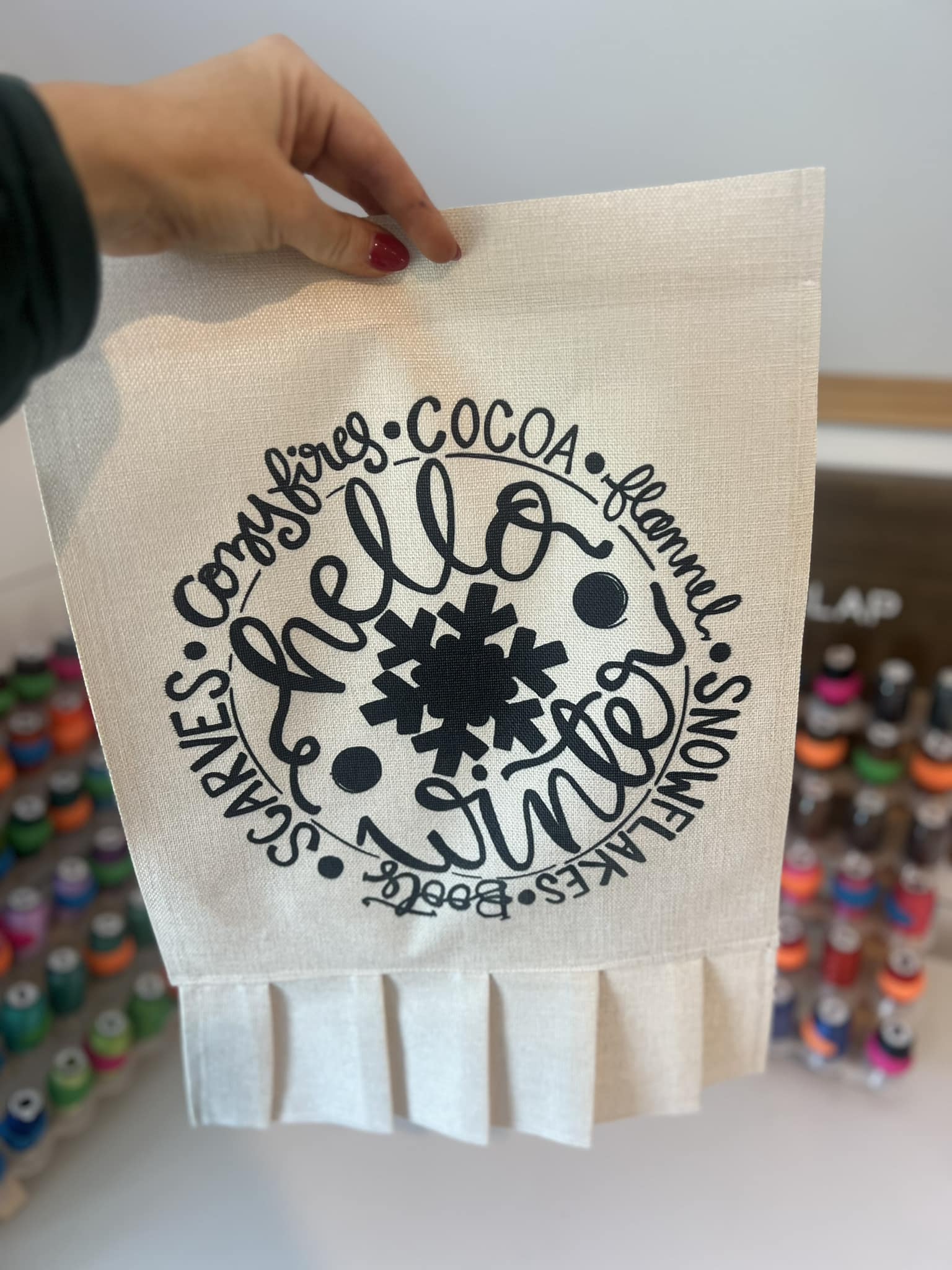 Embrace the cozy charm of the season with this elegant wheat-colored ruffle flag. Featuring soft, flowing ruffles that catch the breeze and a warm, neutral palette, it's the perfect way to welcome winter's gentle beauty to your home or garden. The delicate texture and inviting design create an understated sophistication that complements any décor. Ideal for those who appreciate seasonal touches with a touch of rustic elegance.