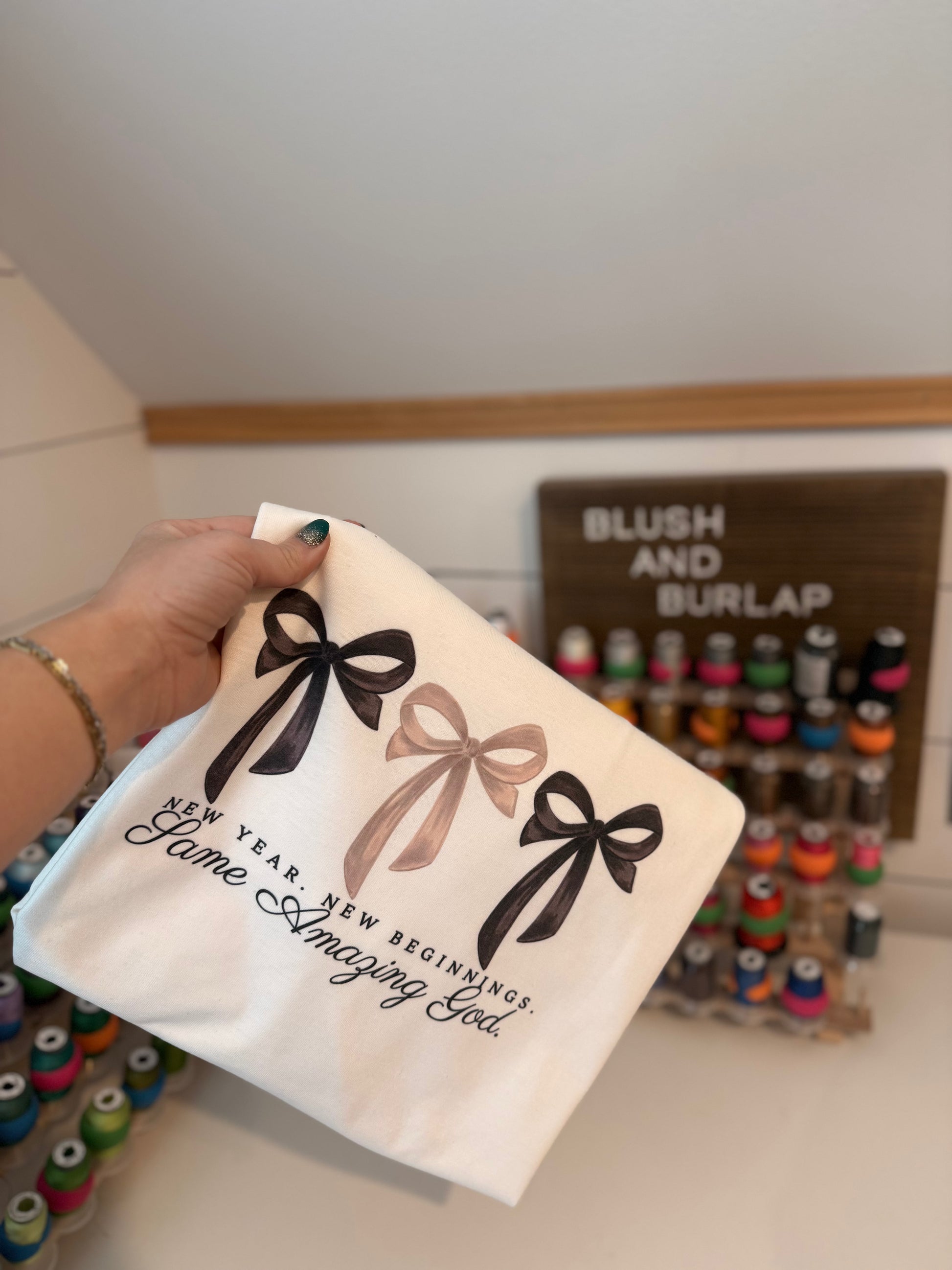 Embrace fresh starts with intention. This coquette-inspired faith shirt celebrates the promise of new beginnings while honoring what remains constant—your unwavering belief. Soft, feminine details meet meaningful messaging in a design that speaks to both style and spirit. Perfect for those ready to step into the year with grace, confidence, and gratitude. A wearable reminder that transformation and faith go hand in hand.