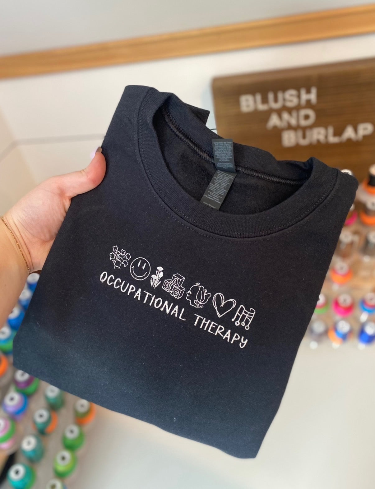 Celebrate your passion for occupational therapy with this thoughtfully embroidered sweatshirt. Choose from a curated selection of meaningful OT icons and customize your thread color to match your personal style. Crafted for comfort and durability, this piece honors the dedication of therapy professionals while making a subtle statement. Perfect for clinical settings, professional events, or everyday wear that reflects your commitment to the field.
