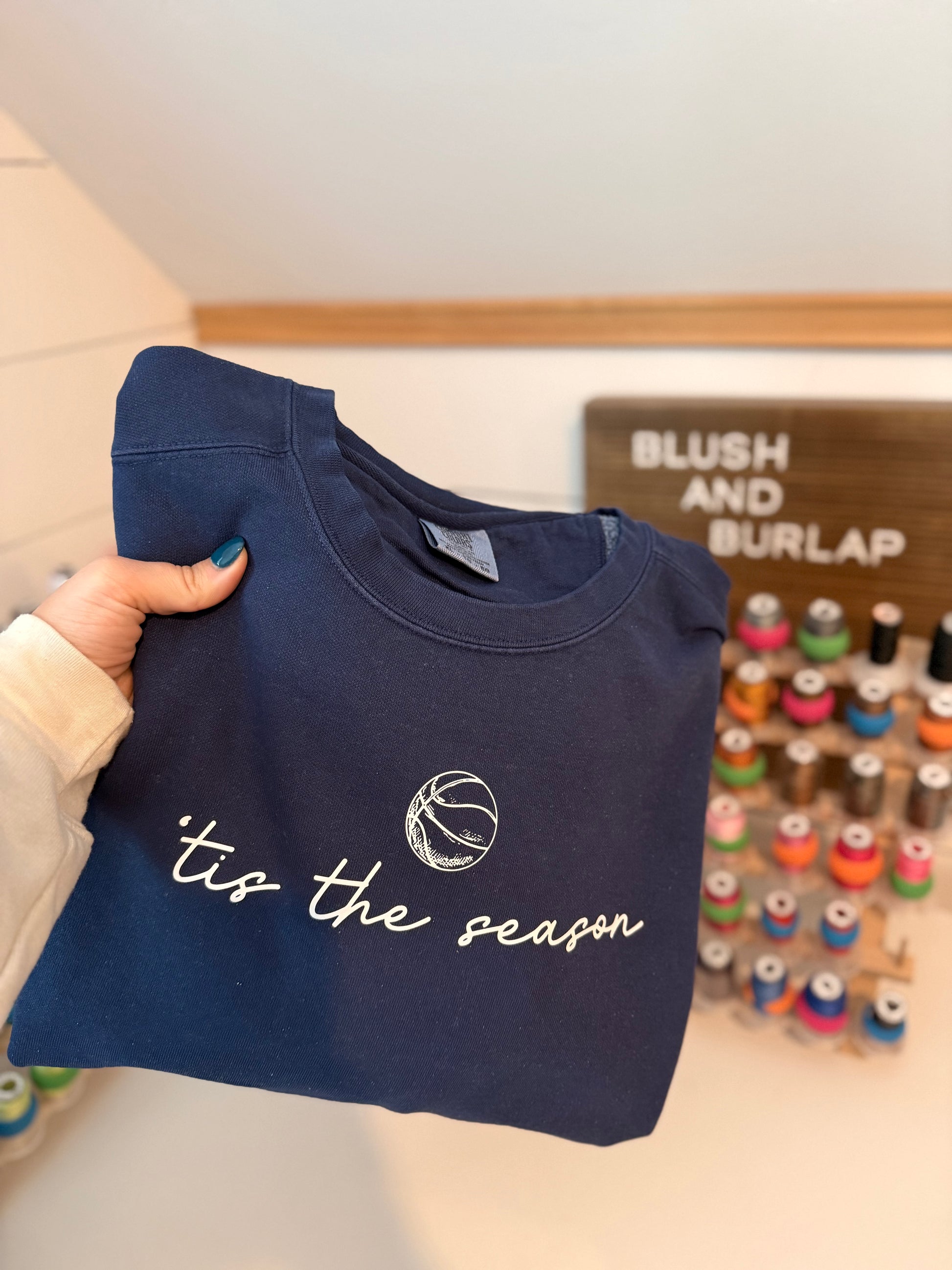 Elevate your game-day style with this basketball sweatshirt, featuring a bold "Tis the Season" design brought to life through premium DTF printing. The soft, durable fabric offers comfort whether you're cheering courtside or layering for casual wear. Perfect for basketball enthusiasts who want to showcase their passion with a design that stays vibrant wash after wash. Ideal for the season ahead. Choose your sweatshirt color and we will pick black/white writing that best suits the color chosen.