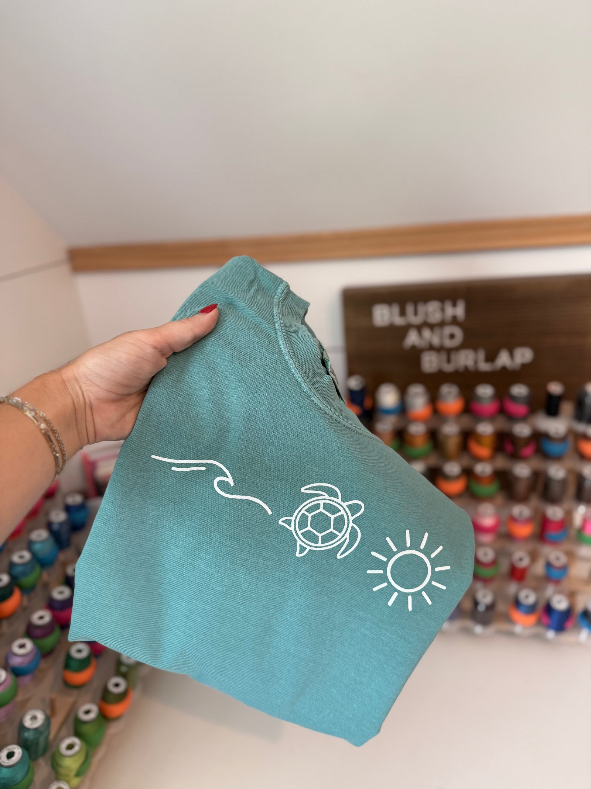 Dive into summer style with the Wave Turtle Sun tee. Featuring playful summer icons on a soft seafoam backdrop, this comfort-focused shirt transitions effortlessly from beach days to everyday adventures. The relaxed fit and breathable fabric make it an ideal companion for vacation getaways or casual warm-weather wear. Perfect for anyone seeking laid-back, feel-good style that captures the essence of the season.