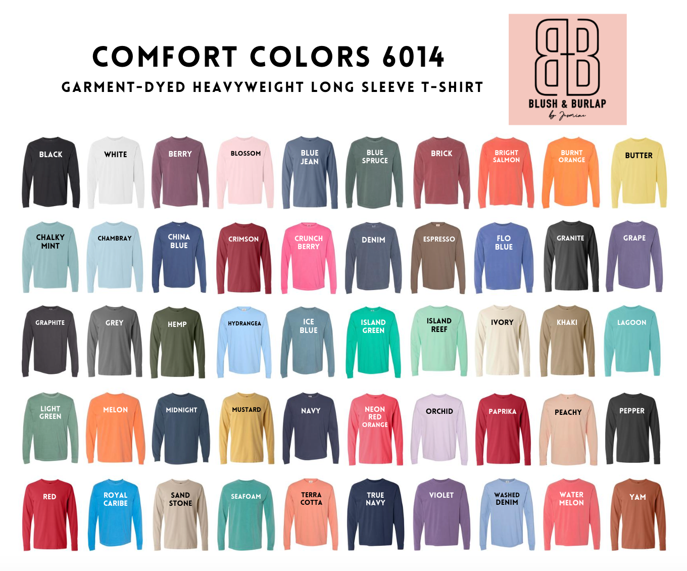 Comfort Colors. 100% cotton. Unisex Sizing. Long or short sleeve is available. Embroidered.