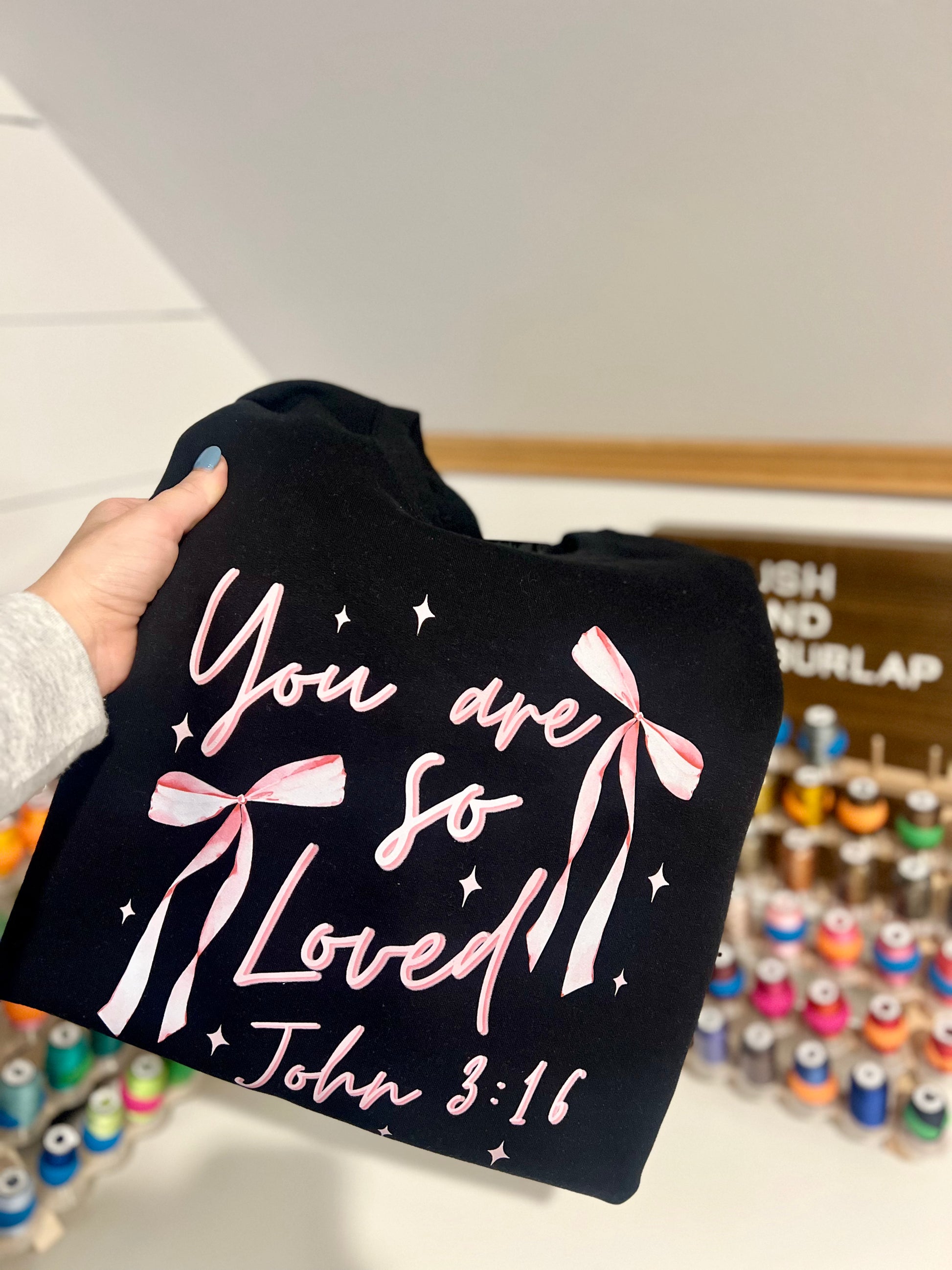 You Are So Loved Coquette Embrace timeless elegance with this stunning coquette design, where scripture-inspired messaging meets romantic bow details. This piece speaks directly to the heart, reminding you of your inherent worth through beautiful biblical sentiment. The soft, feminine aesthetic pairs perfectly with Blush & Burlap's signature style—think delicate bows, graceful lines, and that coveted boutique charm. Ideal for personal wear or as a meaningful gift, you can customize it with your choice of thread colors to match your unique style. A wearable affirmation that celebrates love, faith, and femininity in one exquisite design.